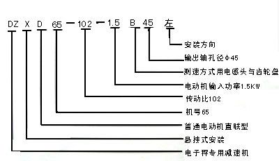 | 型號 | 電機(jī)功率 | 減速比 | 安裝方式 | 測速方式 | 處軸孔徑 | 安裝方向 |